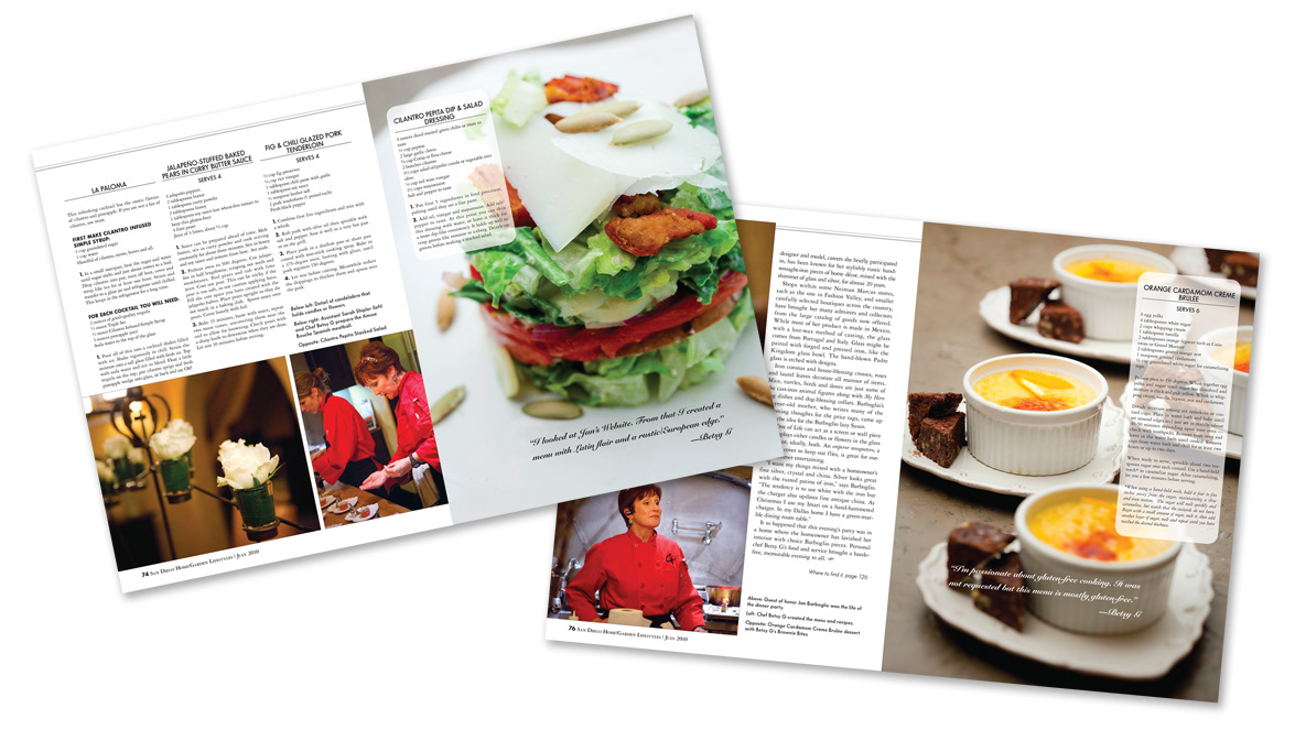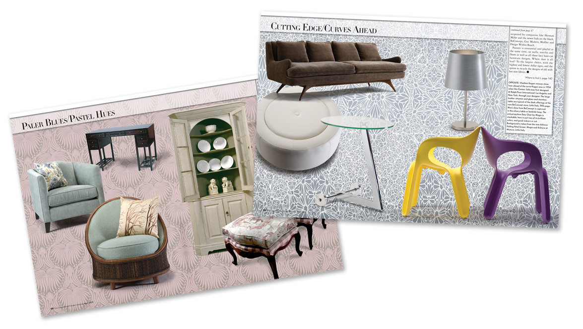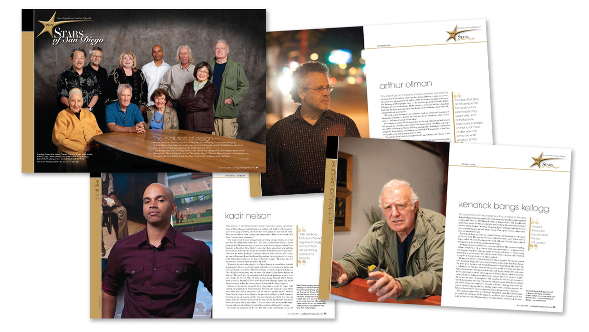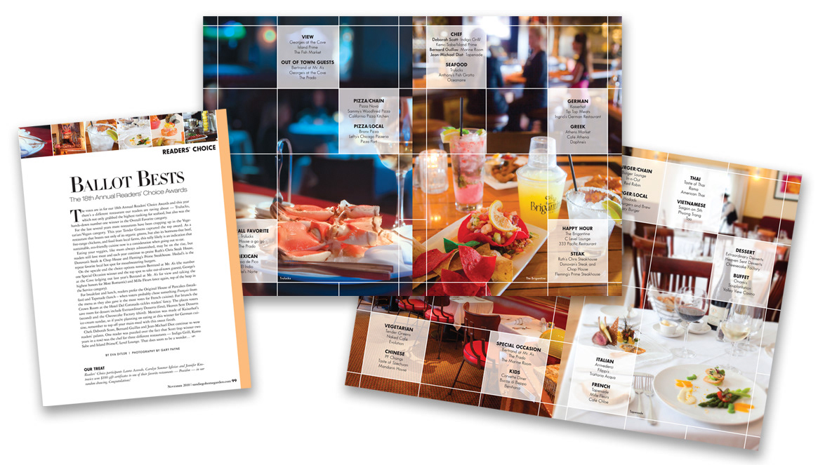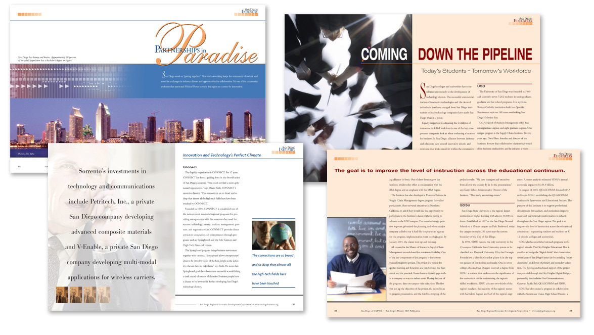 Samples of multiple page editorial layout designs for various monthly print publications.