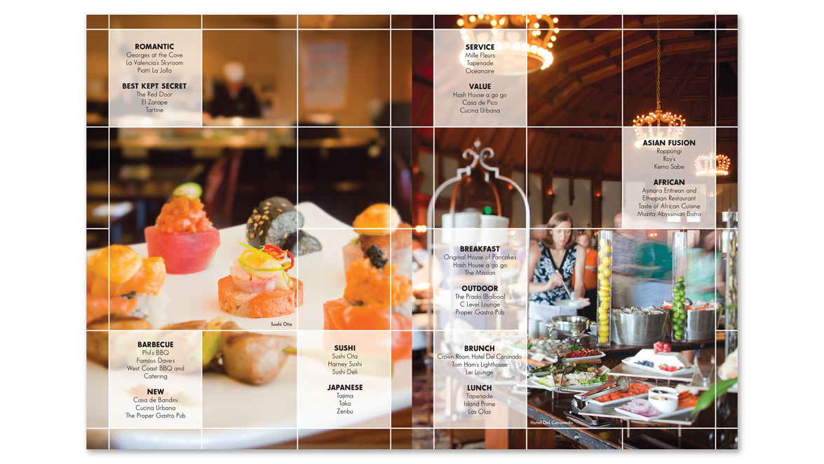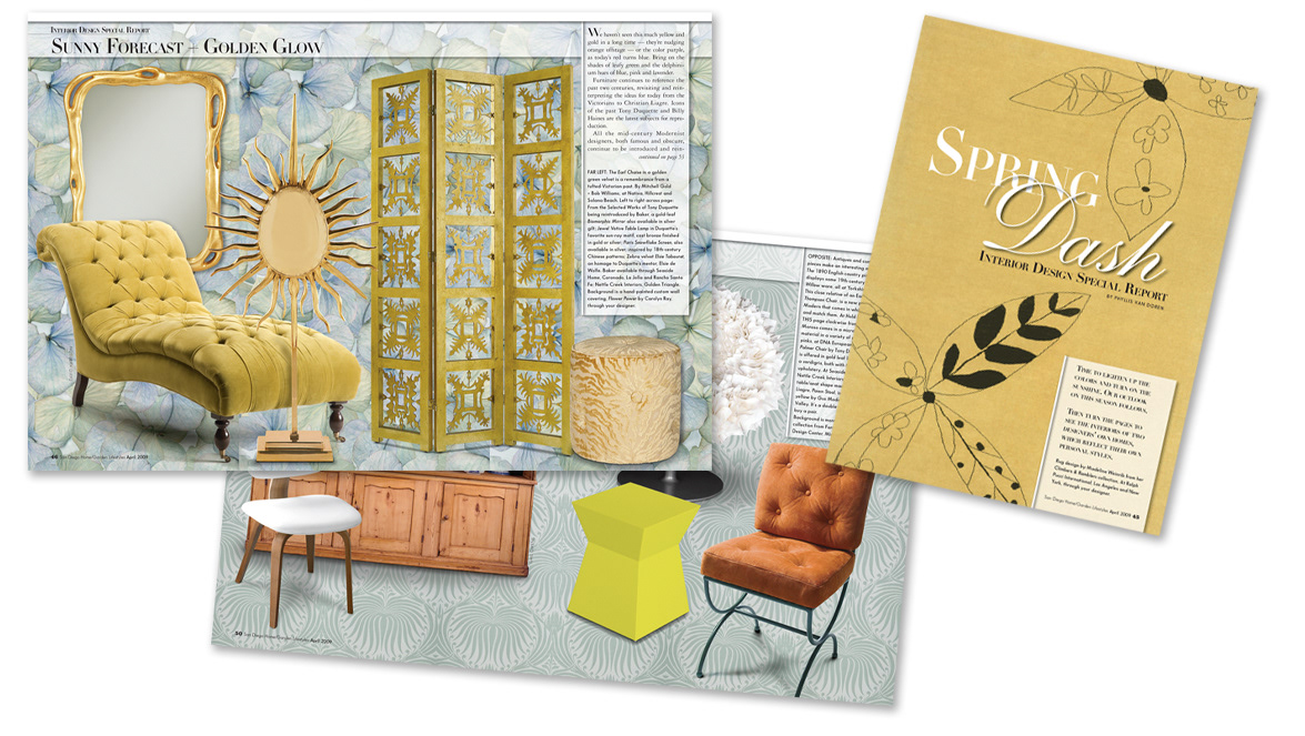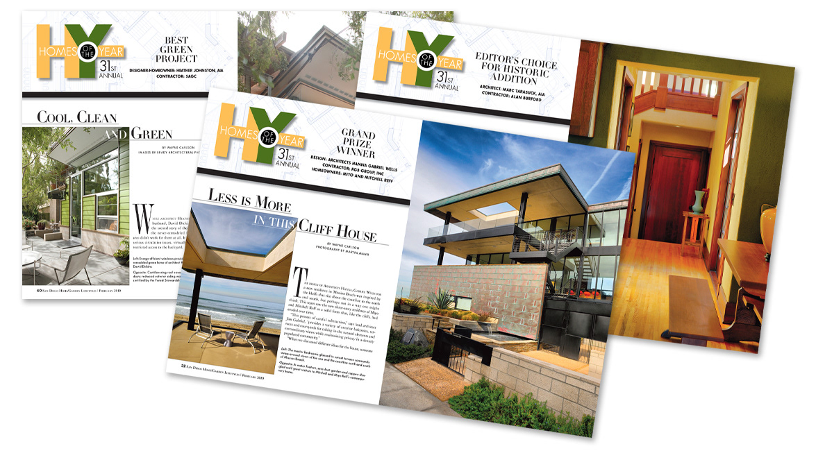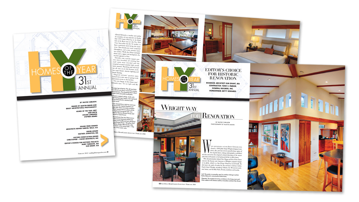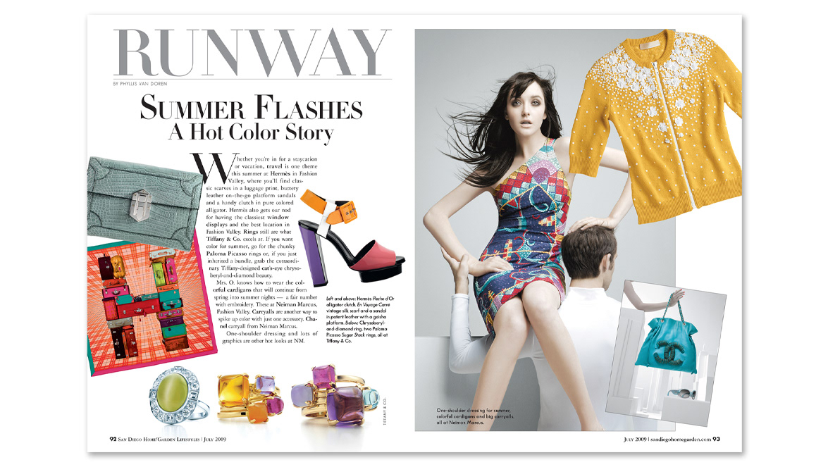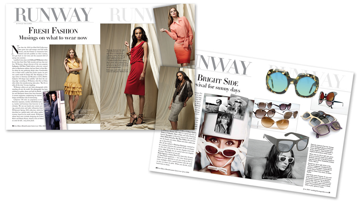 Samples of multiple page editorial layout designs for various monthly print publications.