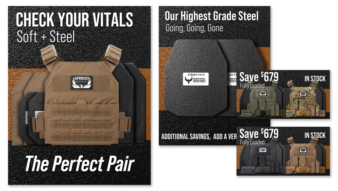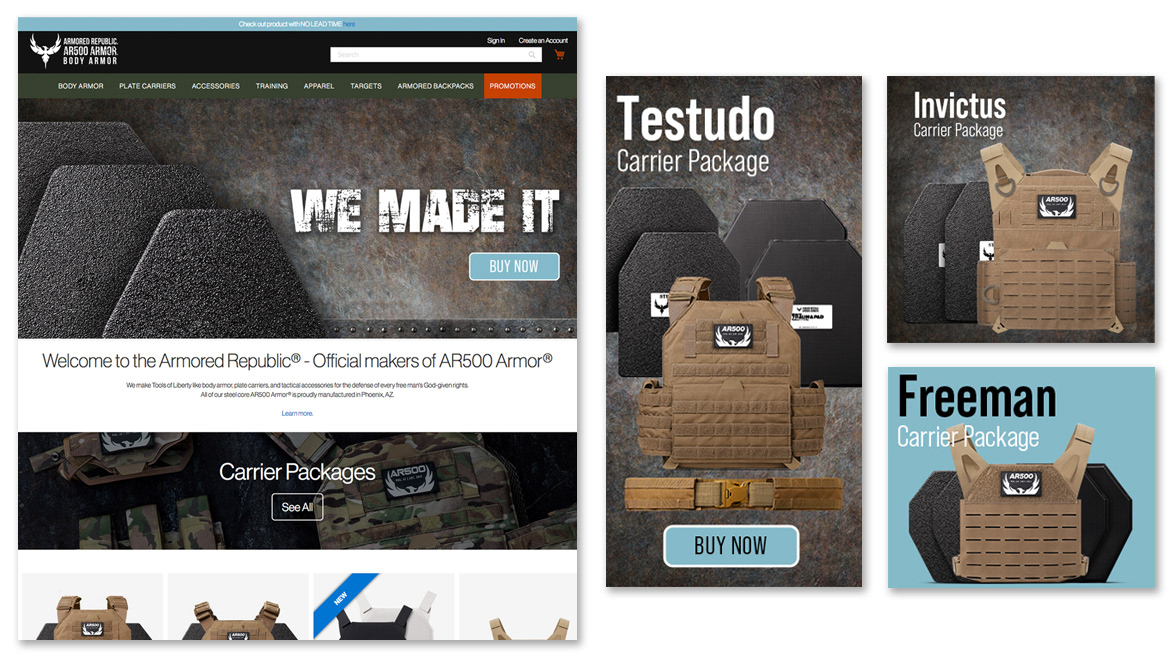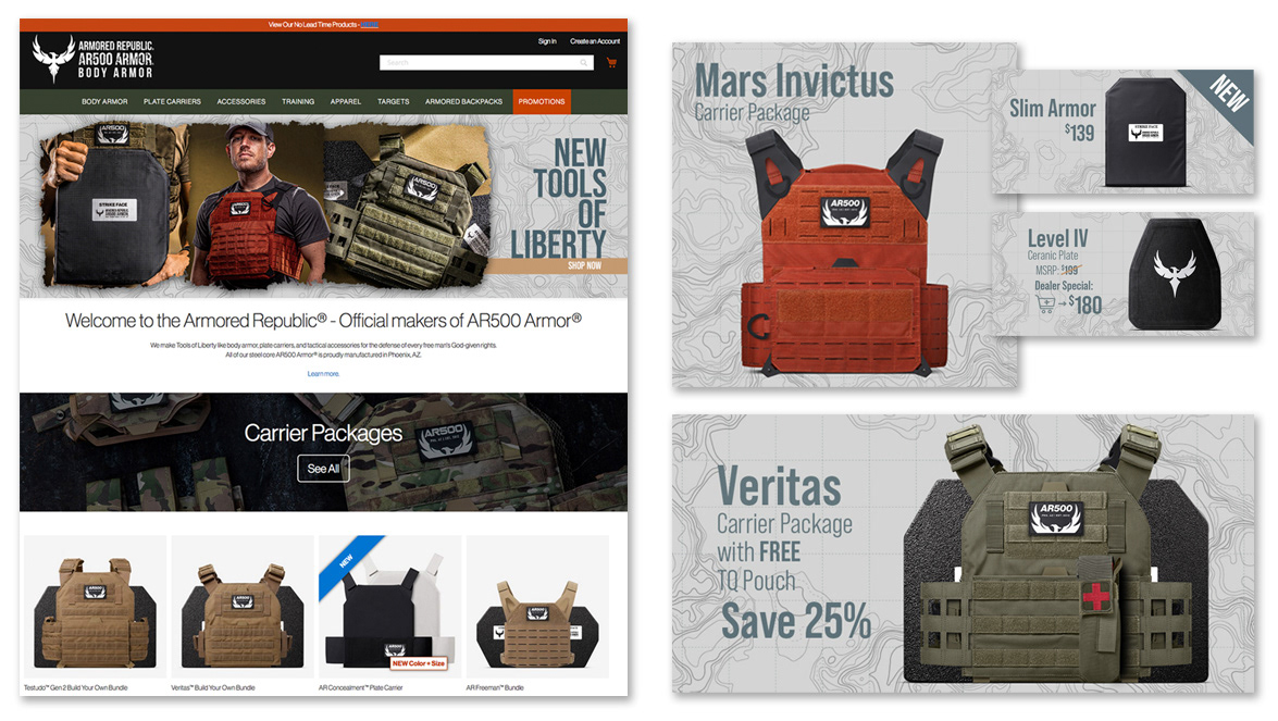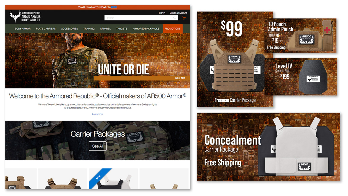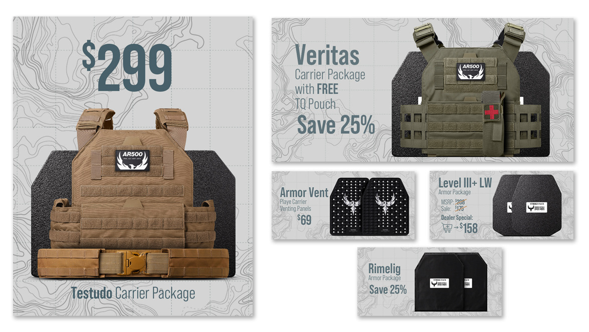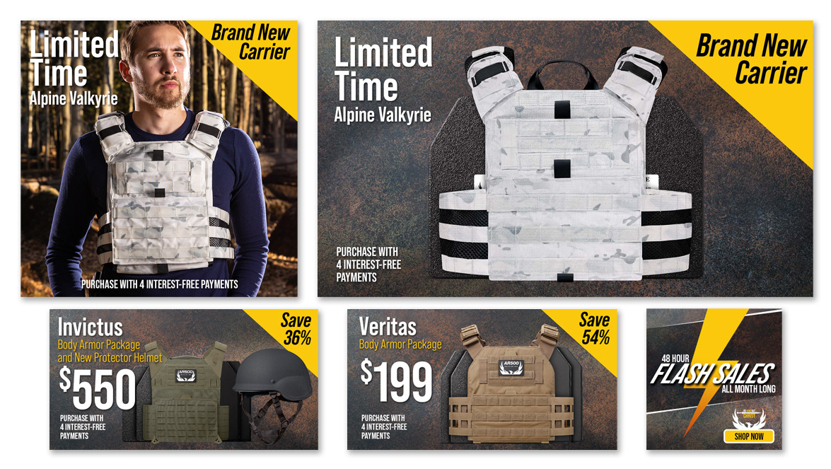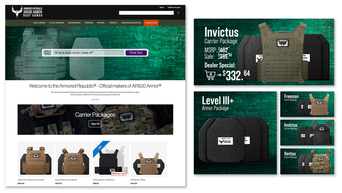 Website home page and advertising artwork for a body armor company. A new campaign was created each month and matching e-commerce artwork followed the campaign.