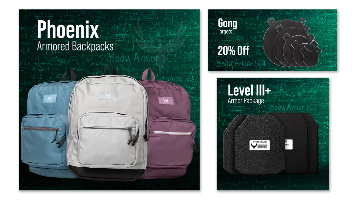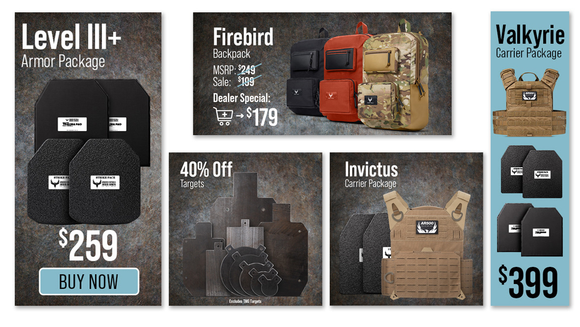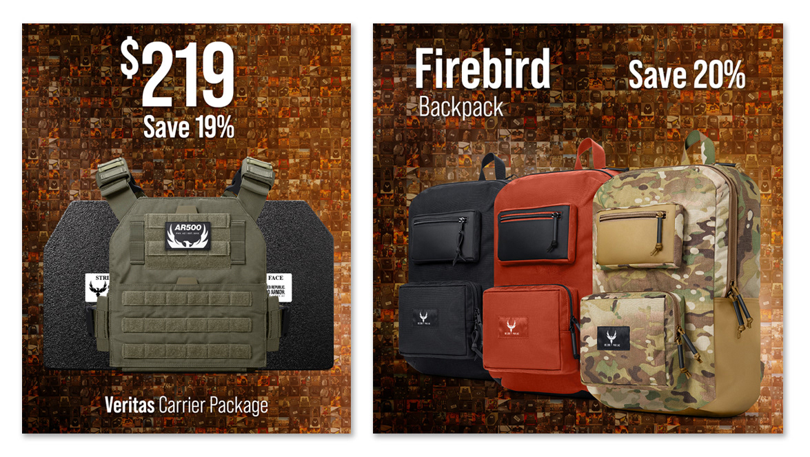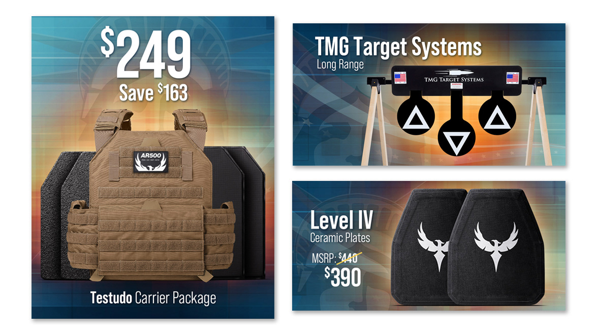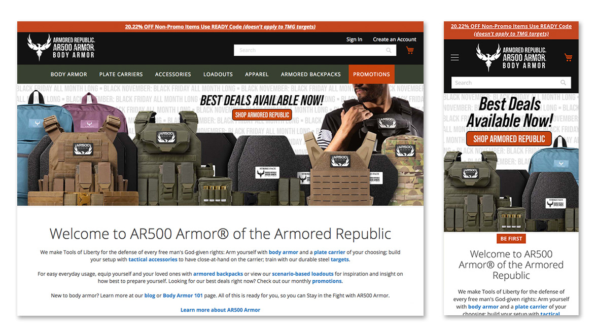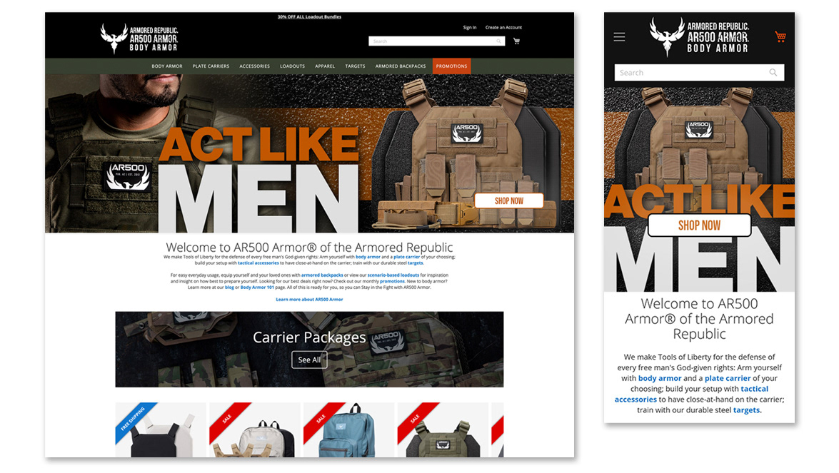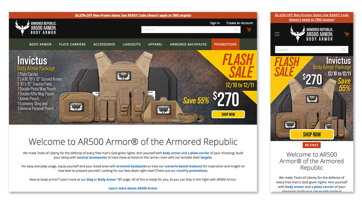 Website home page and advertising artwork for a body armor company. A new campaign was created each month and matching e-commerce artwork followed the campaign.